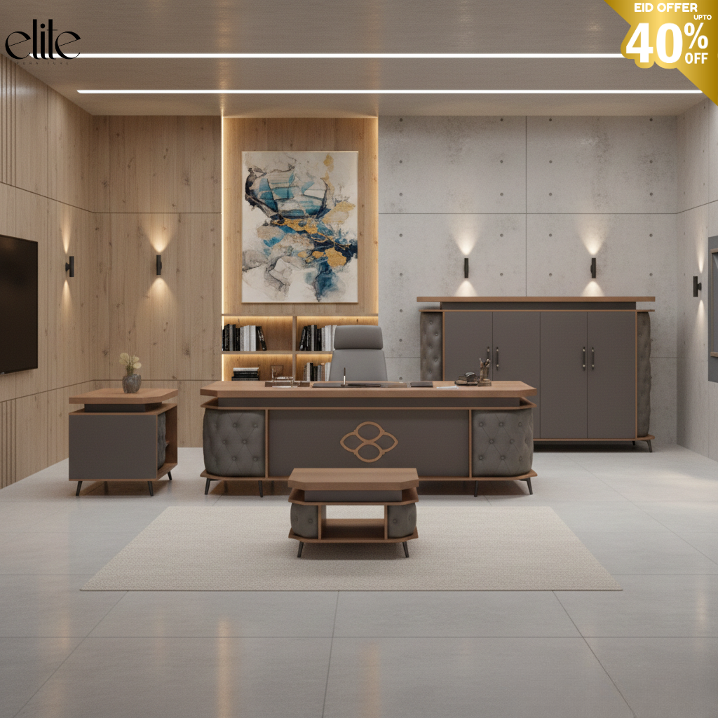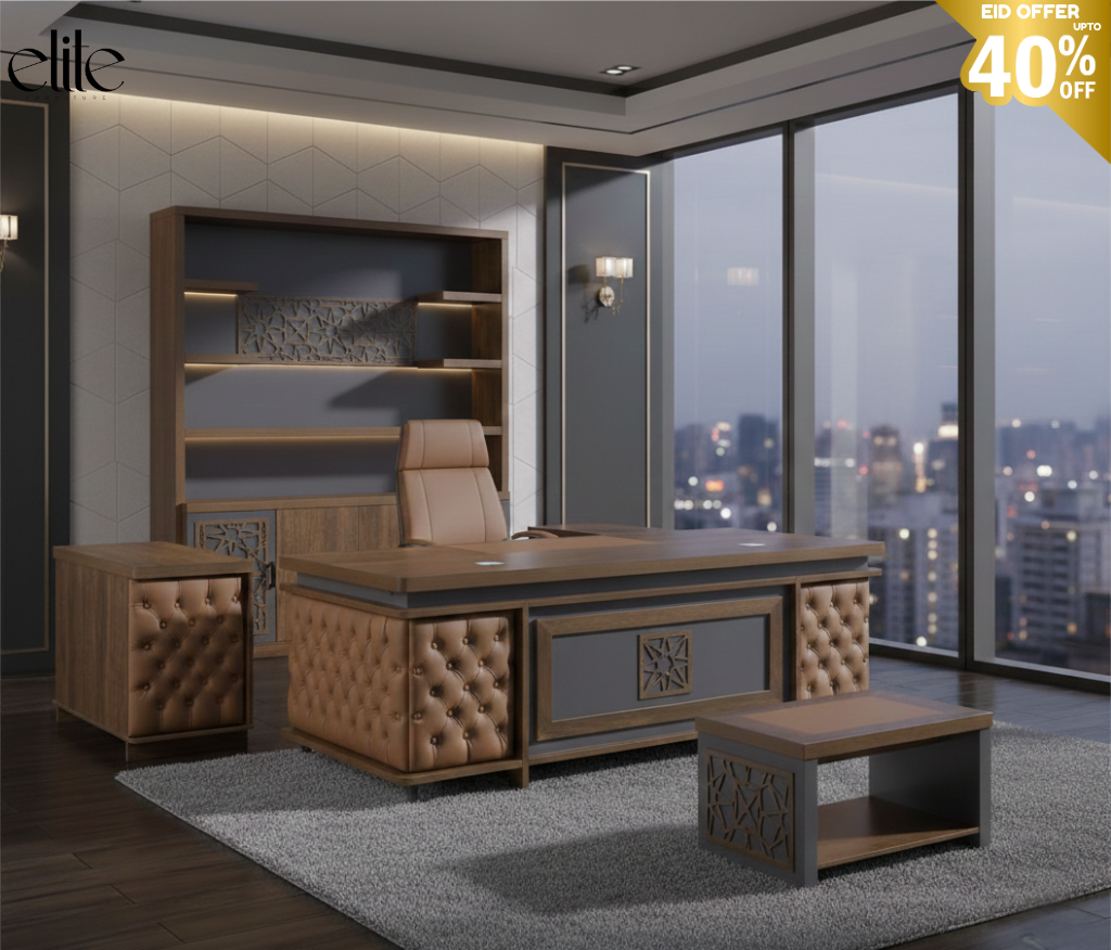 Elite Executive Office Desk Set – Luxury Wooden CEO Desk with Grey Tufted Leather, Islamic Geometric Panels, Side Table, Wall Unit – Eid Special Up to 40% Off- Free installation and Delivery