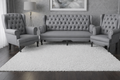 The seating is arranged on a soft, light-colored area rug that contrasts beautifully with the dark wooden flooring, adding warmth and comfort to the space. Behind the set, a textured gray accent wall enhances the sophisticated atmosphere, complemented by an abstract framed artwork that adds a subtle artistic touch.