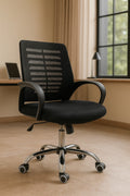 The 602 Low Back Office Chair is the perfect blend of comfort and simplicity. Featuring a breathable mesh back with a modern horizontal cut-out design, this chair ensures proper airflow while maintaining a clean aesthetic. The cushioned seat, fixed curved armrests, and sturdy chrome base with smooth caster wheels provide functionality and support for daily use in any home or office environment.