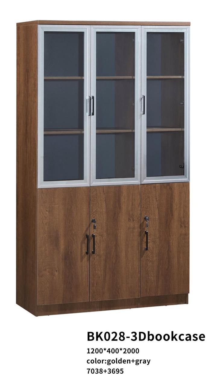 The BK028-3D Bookcase blends durability with a premium aesthetic, offering three spacious glass-paneled upper sections for easy display of books, files, or decor items. Below, three lockable cabinets provide concealed storage for documents or valuables. The elegant golden wood tone paired with modern gray detailing enhances any executive office or professional workspace.