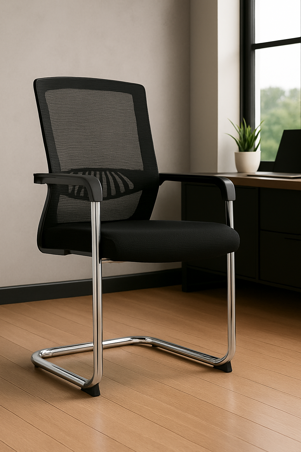 The Modern Mesh Visitor Chair offers a sleek and breathable seating solution for guest and conference spaces. Featuring a ventilated black mesh backrest and contoured seat cushion, this chair ensures comfort even during extended meetings. The chrome-plated cantilever frame provides stability and style, while the fixed armrests add extra support. Ideal for reception areas, offices, and meeting rooms.