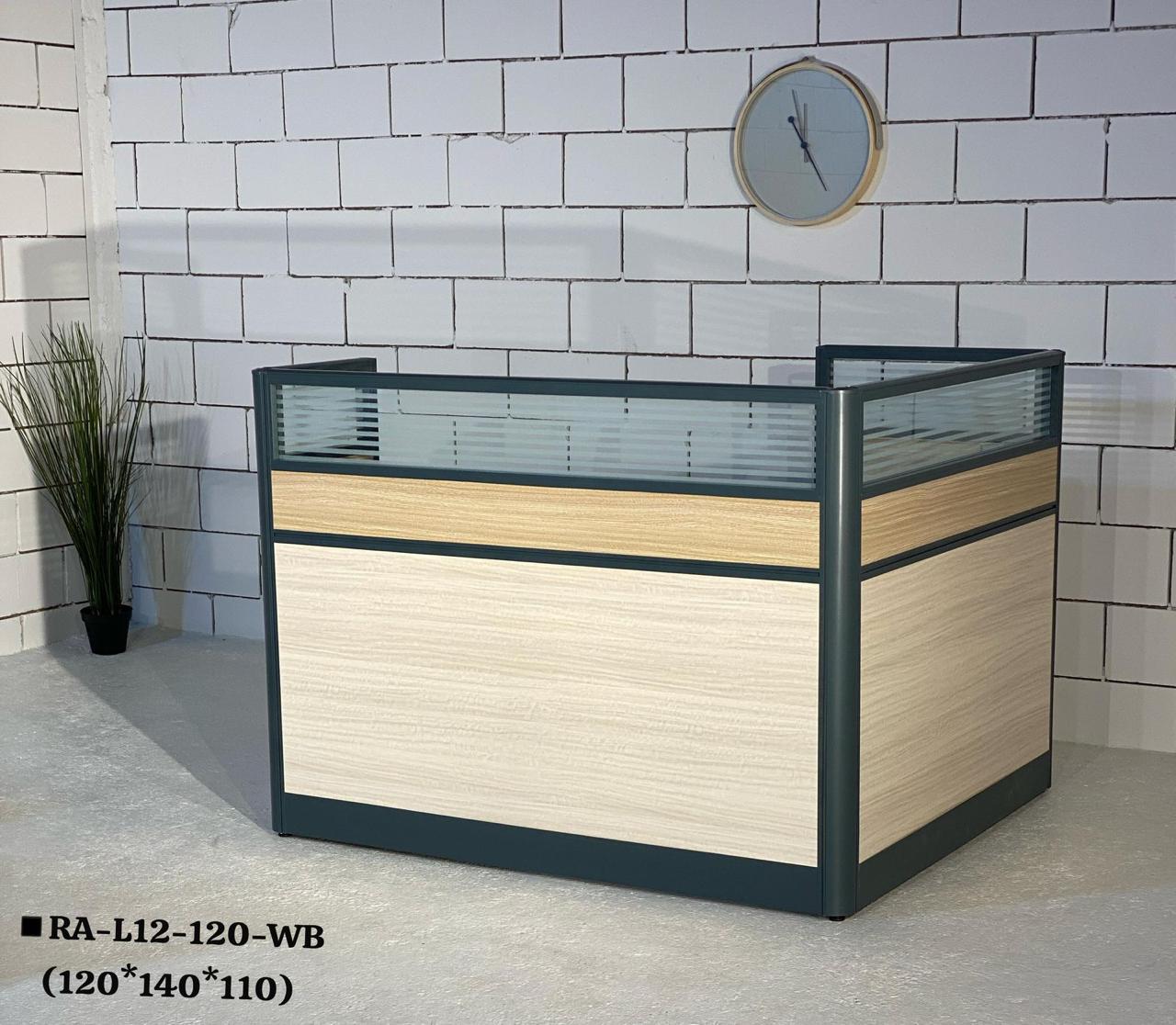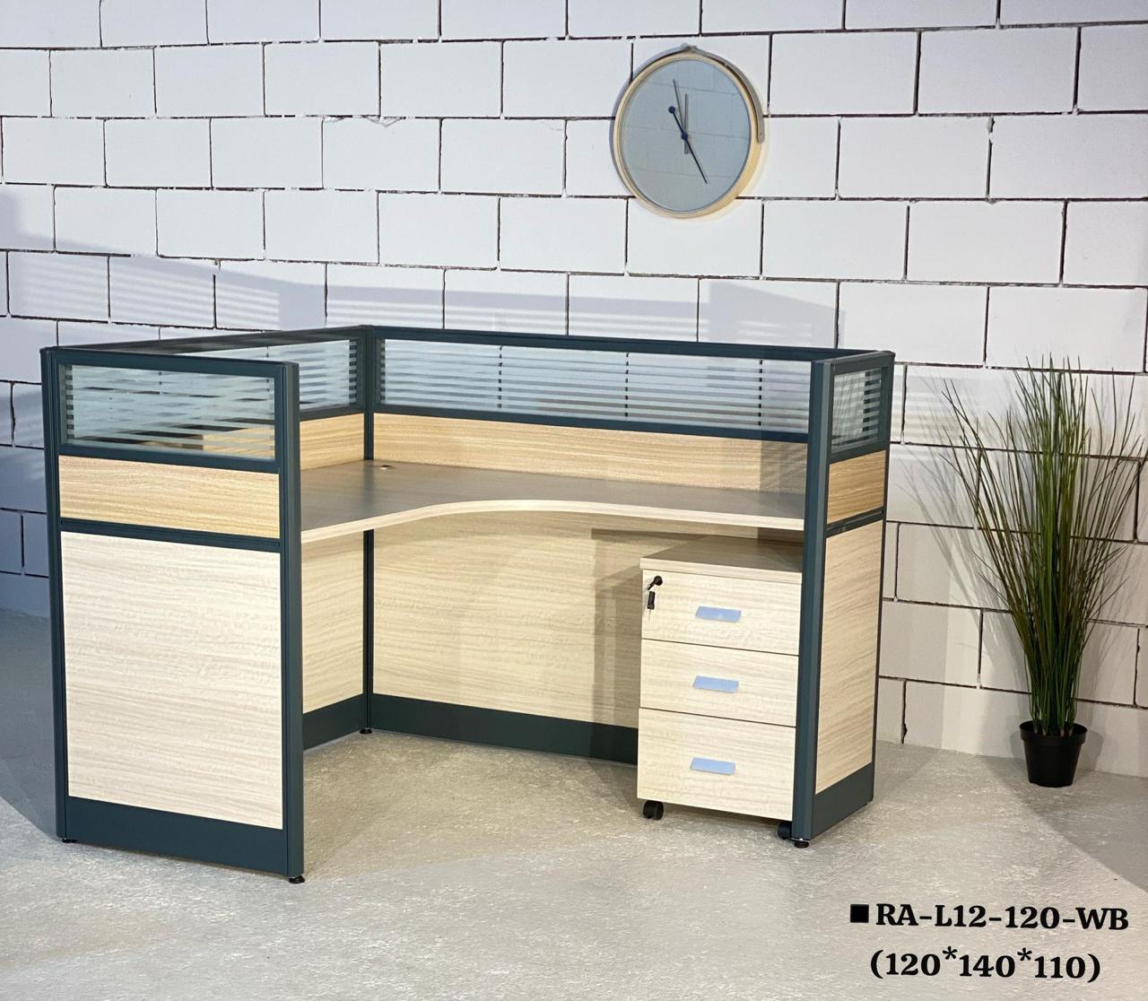 The RA-L12-120-W is a contemporary L-shaped office cubicle workstation designed to maximize privacy and productivity in compact spaces. With a minimalist white and charcoal frame, the unit features frosted glass paneling for added light diffusion and a modern aesthetic. The integrated mobile pedestal drawer with lockable storage offers secure organization, while the curved desktop design promotes ergonomic comfort.